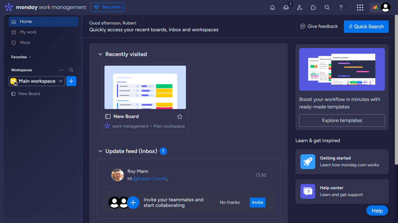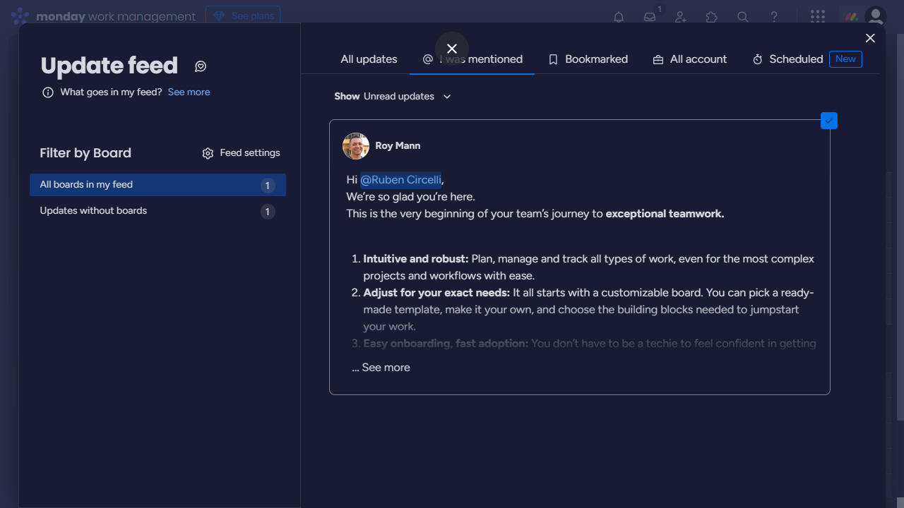 Monday.com is a work management solution for teams first and foremost, not individuals, so staying in touch with coworkers is a key feature. Luckily, Monday.com makes this easy. Click on your update feed at the top-right of the interface to find bookmarks of important updates, updates in which someone directly mentioned you, and updates on your boards in general. The communications features aren't too advanced, but they work fine.