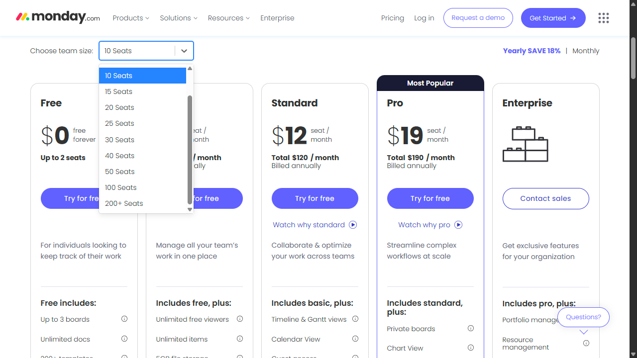 When you sign up for a Monday.com subscription, you have to choose a team size. This is problematic because you can select only among preset team sizes that aren’t just multiples of five. For example, you can sign up for a three-person plan but not a six-person plan, or a 25-person plan but not a 35-person plan. In other words, you can't just pay for a plan that fits the exact size of your team, in most cases, which might lead to unnecessary spending. If you try to select 40 seats for any plan, you need to contact the sales department, too.