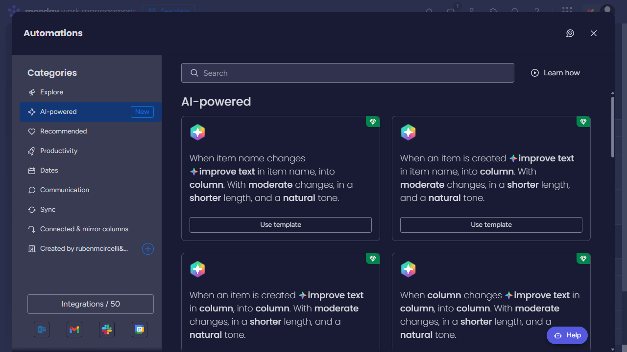 Integrations and automation are where Monday.com shines. With a paid subscription, you can connect your Monday.com account to other apps your team uses. At the time of writing,hundreds of integrations are available, including DocuSign, Excel, GitLab, Gmail, Mailchimp,Microsoft Teams, Outlook, and Slack. Integrations with other apps allow you to automatically move information between them. For example, you can sync all the dates from a specific board to your Google Calendar. When you add a new date to the board, it automatically appears in your Google Calendar. Integrations can save your team time by eliminating the need to copy data from one place to another.